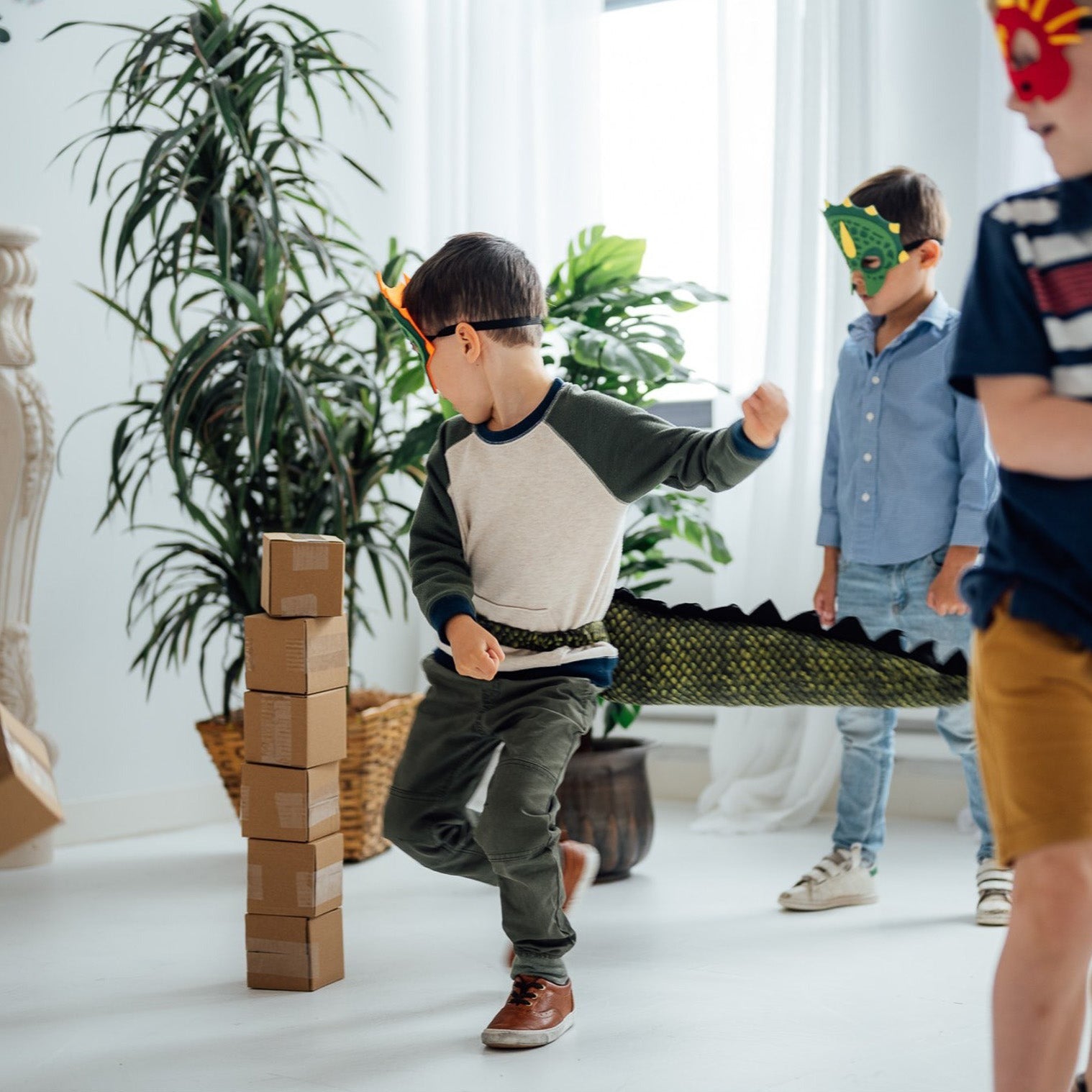 The roarsome fun begins as kids take turns attempting to topple towering stacks of cardboard blocks. With each thrilling knock-down, they'll feel the thunderous power of their dino alter-egos. But that's not all! The birthday dinosaur gets to claim their very own swishing Murph & Moose dinosaur tail to wear with primal pride.